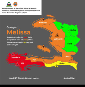 The Haitian Health Foundation has been mobilizing for days to prepare communities for Hurricane Melissa, now predicted to become a Category 5 Hurricane in the Caribbean. In Haiti, it has already been raining for days, causing mudslides, washing away homes, trees, crops, and causing injuries and deaths. Before this most recent hurricane, in the Grand’Anse, thousands had already fled the violence of the capital to come to the Grand’Anse, where HHF is located. This means we need to further stretch the already scarce resources.